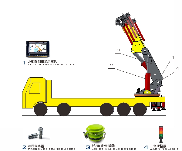 折臂吊力矩限制器主要由力矩限制器顯示器、長(zhǎng)/角度傳感器、液壓傳感器等組成。通過(guò)各傳感器檢測(cè)信號(hào),可以實(shí)時(shí)在顯示器上顯示起重機(jī)的額定起重量、實(shí)際起重量、角度、作業(yè)幅度等信息,并根據(jù)情況輸出報(bào)警信號(hào)和控制信號(hào),輔助作業(yè)人員安全操作起重機(jī)。