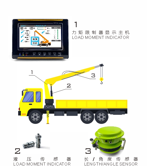 隨車起重機(jī)力矩限制器主要由力矩限制器顯示主機(jī)、液壓傳感器、長/角度傳感器組成。通過各傳感器檢測(cè)信號(hào),可以實(shí)時(shí)在顯示器上顯示起重機(jī)的額定起重量、實(shí)際起重量、臂長、角度等信息,并根據(jù)情況輸出報(bào)警信號(hào)和控制信號(hào),輔助作業(yè)人員安全操作起重機(jī)。